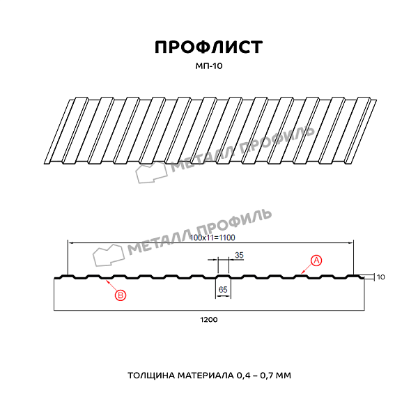 МП-10 – один из классических типов стенового профиля. Он замечательно смотрится в виде вентилируемого фасада, забора, стенового материала, декоративного ограждения, подвесного потолка в нежилых зданиях. МП-10 обладает трапециевидной формой гребня, идентичной на сторонах А и В. Глубина гребня – 10 мм, это не придаёт металлопрокату высокой несущей способности, но при обшивке стен это не самое главное. В то же время лаконичный рельеф поверхности не придаёт строению брутальный облик. На прочностные свойства можно повлиять, выбрав различную толщину стальной основы. Данный профиль прокатывается в вариациях от 0,4 до 0,7 мм. Повысить защиту от ржавчины поможет защитный полимерный слой. Покрытие не только обладает богатым цветом, устойчивым к выгоранию на солнце, но и предупредит небольшие физические дефекты и корродирование стали.