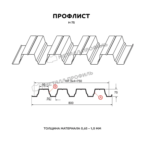 Профлист МЕТАЛЛ ПРОФИЛЬ Н-75x750-A (ПЭ-01-1035-0,7) часто используется для обустройства профилированного листа. Изначально он представляет собой лист оцинкованной стали с покрытием. Толщина стальной основы с цинковым и декоративно-защитным покрытием — 0.7 мм. Проходя процедуру холодного проката, металл приобретает рисунок из ритмичных волн. Несущая способность такого листа гораздо выше плоского.